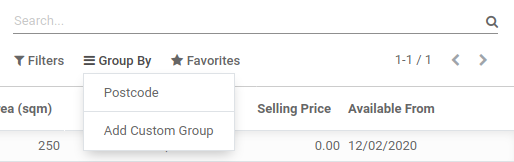 in the search view, we must be able to search on more than just the name. Specifically, we want a filter for the ‘Available’ properties and a shortcut to group by postcode.